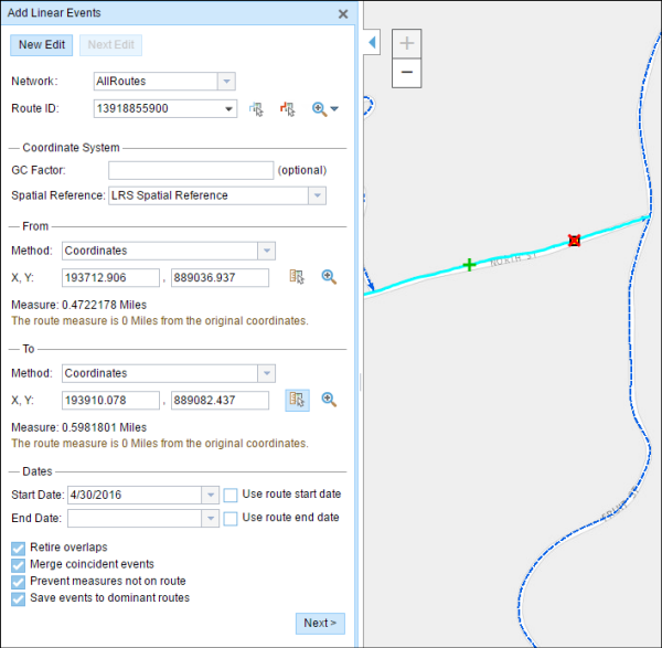 Characteristics of a route such as speed limit or functional class can be represented as a linear event with starting and ending measure information along the route. The Line Events tool provides an interface to add linear events by typing or selecting their x- and y-coordinates. You can also use reference offset data to add events to a route. The reference offset data is translated to routes and measures for storage.