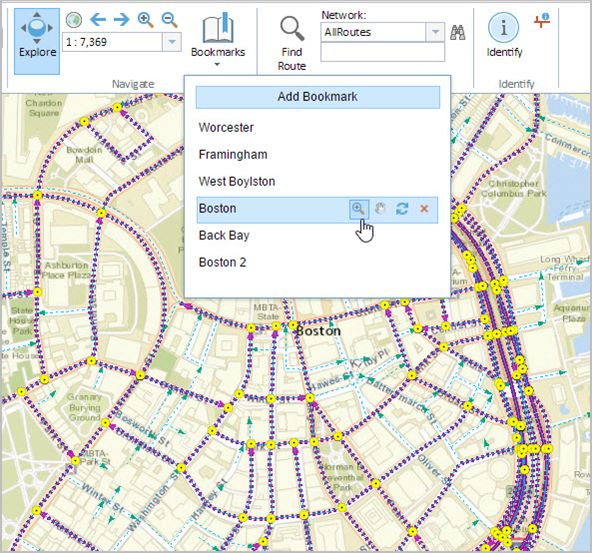 1. To pan and zoom to a saved location, click the Bookmarks button Bookmarks and click an existing bookmark.